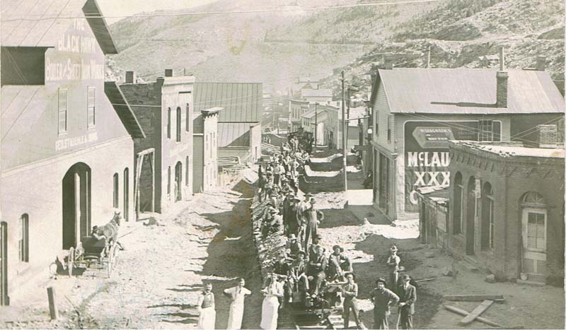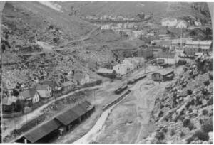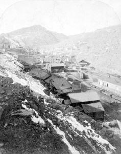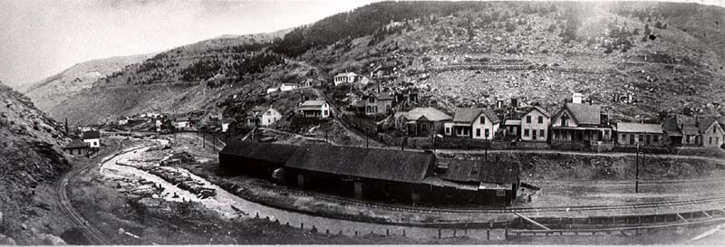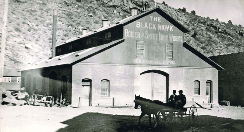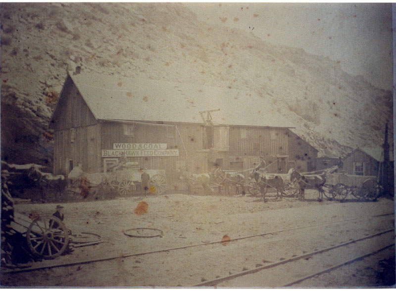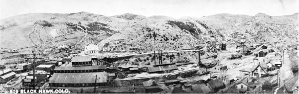 mines. Black Hawk got its name from an early mining manufacturing company in Rock Island, IL. The owners named their quartz mill “Black Hawk” for the famous Sac and Fox Indian Chief. The mill was constructed in 1860 and located near the center of town. After the placer gold and decomposed quartz ore was exhausted, Black Hawk and the surrounding towns fell into a slump during the late 1860s. As the mines got deeper, complex sufide ores were encountered which could not be milled by the primitive stamp mills. What was needed was a smelting process where the ore was first heated to drive off the sulfur followed by smelting. It was Prof. Nathaniel P. Hill who brought this technology to Black Hawk in the form of a successful smelter, opened in January, 1868. In 1877, Black Hawk’s smelters were processing half of all the ore mined in Gilpin County. The old stamp mills, now rendered useless, were converted into concentrators. Their purpose was to separate the worthless rock from valuable ore-producing concentrates which were sent to the smelters to produce a copper, gold and silver matte Below are historic pictures culled from various sources of the railroads, mines and mills around Black Hawk Colorado. Other photos of Black Hawk can be found at these pages...