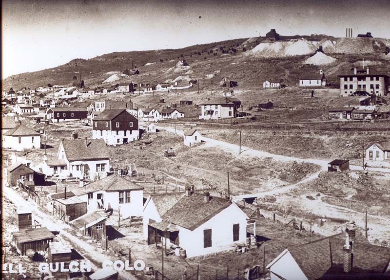 During the winter, the residents unable to do much mining and prospecting, organized the town and the district, drawing up some of the first mining laws in the territory. They were progressive laws, too. Woman had the same rights as men and only children under ten were prohibited from holding claims. When spring came the following year, so did hundreds more fortune seekers. Soon Russell Gulch was bulging with 2,500 citizens. A federal hall, brick school house, a church and dozens of business houses were build. Russell left the area in 1862 to join the Confederate Army (he was originally from Georgia). He returned to Colorado and remained until 1875 when he joined the Cherokees in Oklahoma. His wife was a Cherokee squaw. Russell Gulch became notorious during prohibition days as many bootleggers hid away in the mines using some of the deserted mine shafts as warehouses for their merchandise. Below are historic pictures culled from various sources of the railroads, mines and mills around Russell Gulch. Click on an image for a larger